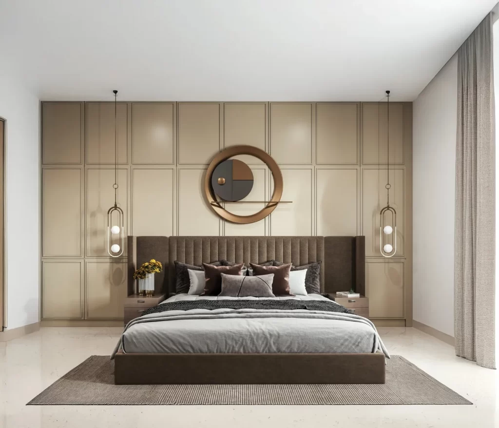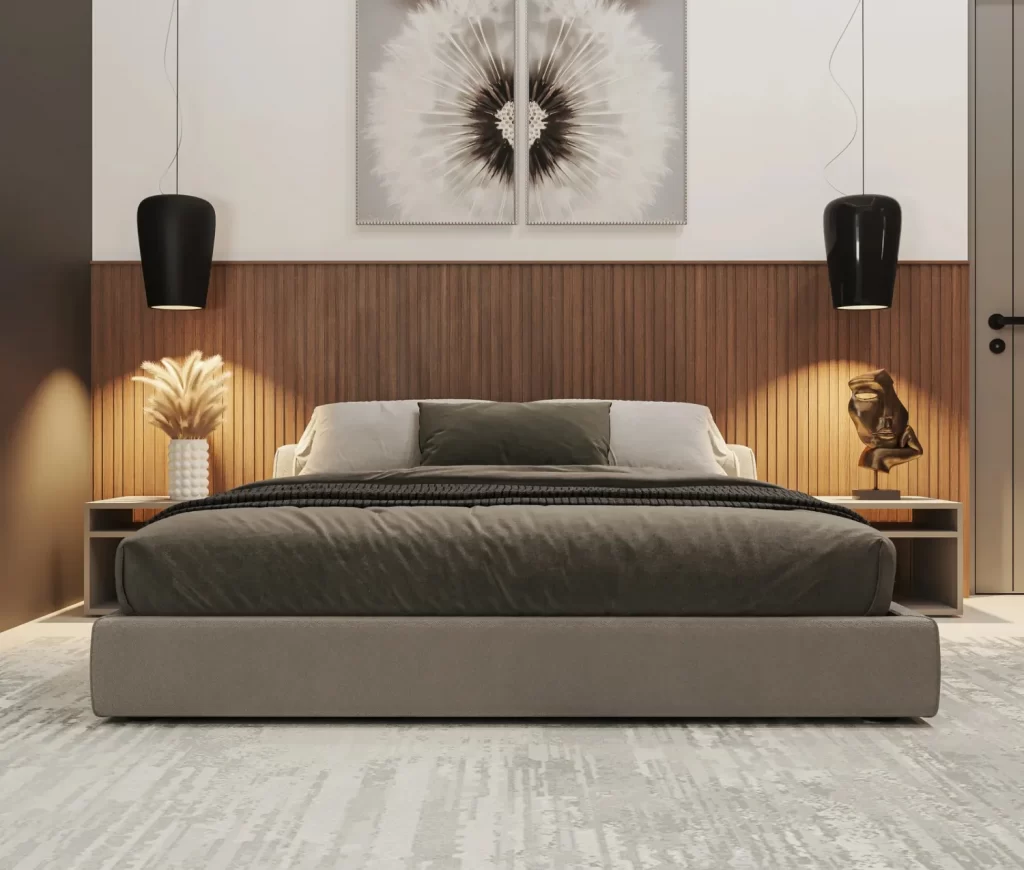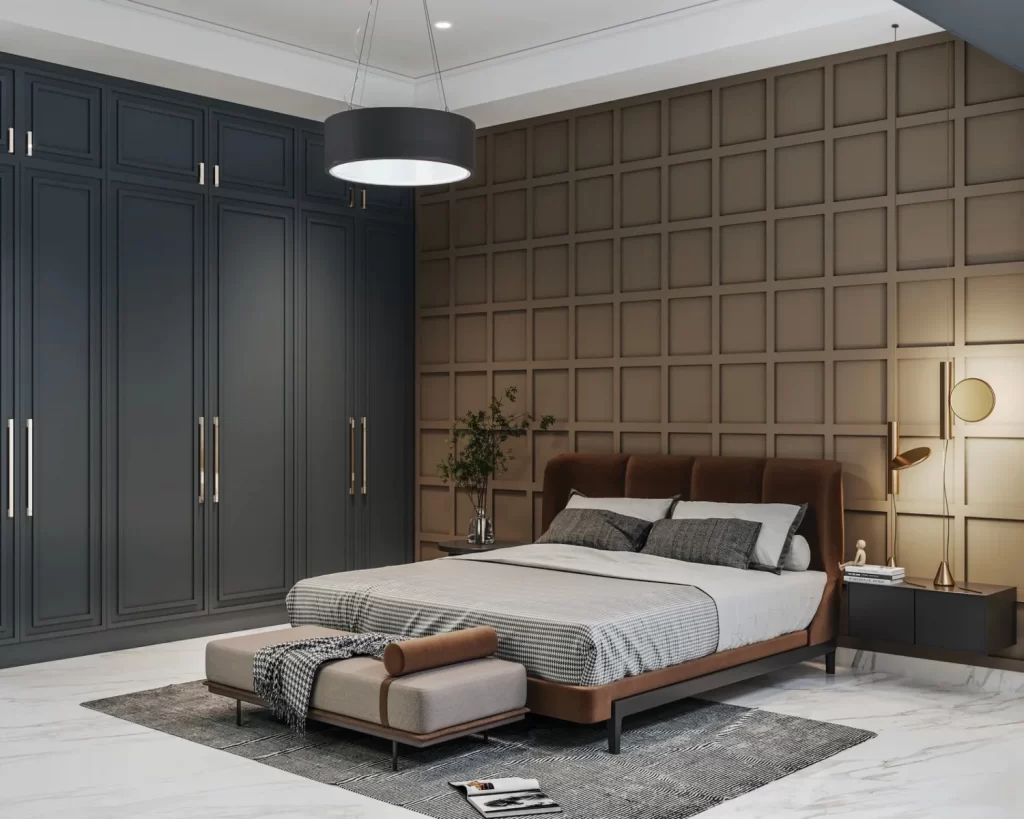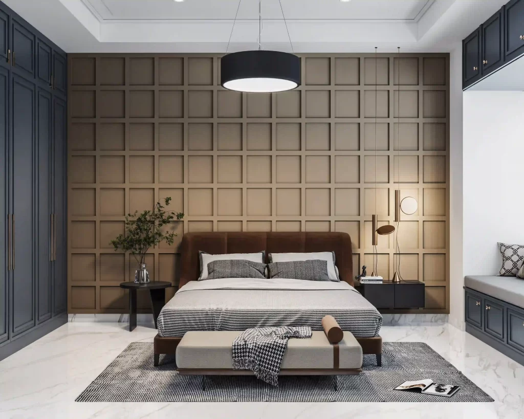This modern bedroom design showcases elegance through clean lines, balanced tones, and thoughtful symmetry. The wall detailing creates a bold yet calming backdrop, while the lighting adds a warm, inviting glow. The overall design promotes comfort, relaxation, and style, an inspiring idea for creating a bedroom that blends sophistication with serenity.