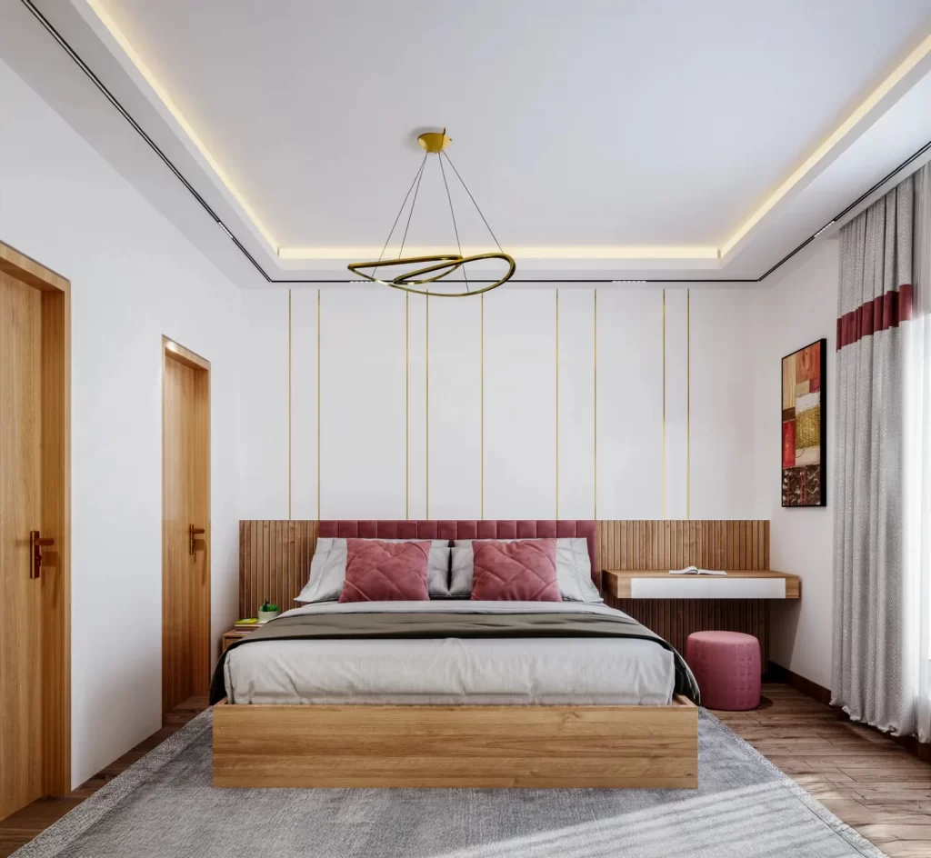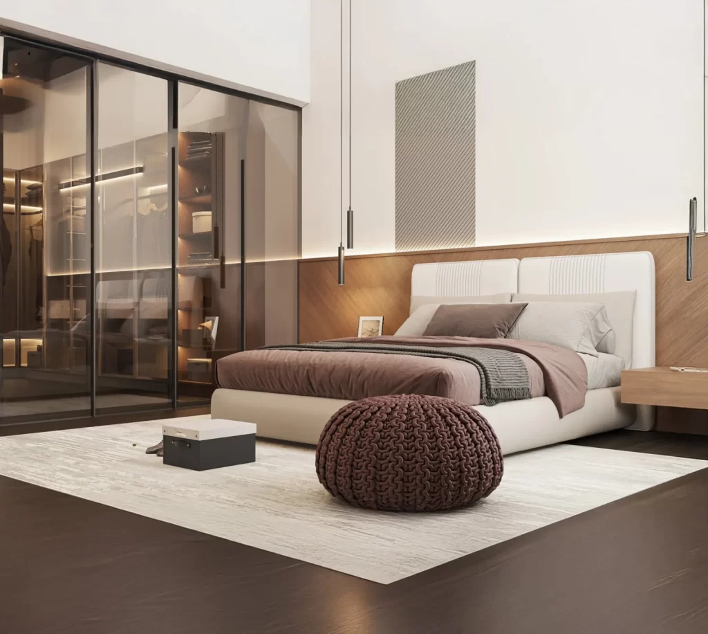 This bedroom interior design idea showcases a perfect fusion of modern aesthetics and cozy comfort. The minimalist layout enhances openness, while soft colors and geometric lighting create a refreshing, elegant ambiance. Thoughtful accents and balanced proportions make this space both stylish and functional ideal inspiration for a serene and contemporary bedroom retreat.