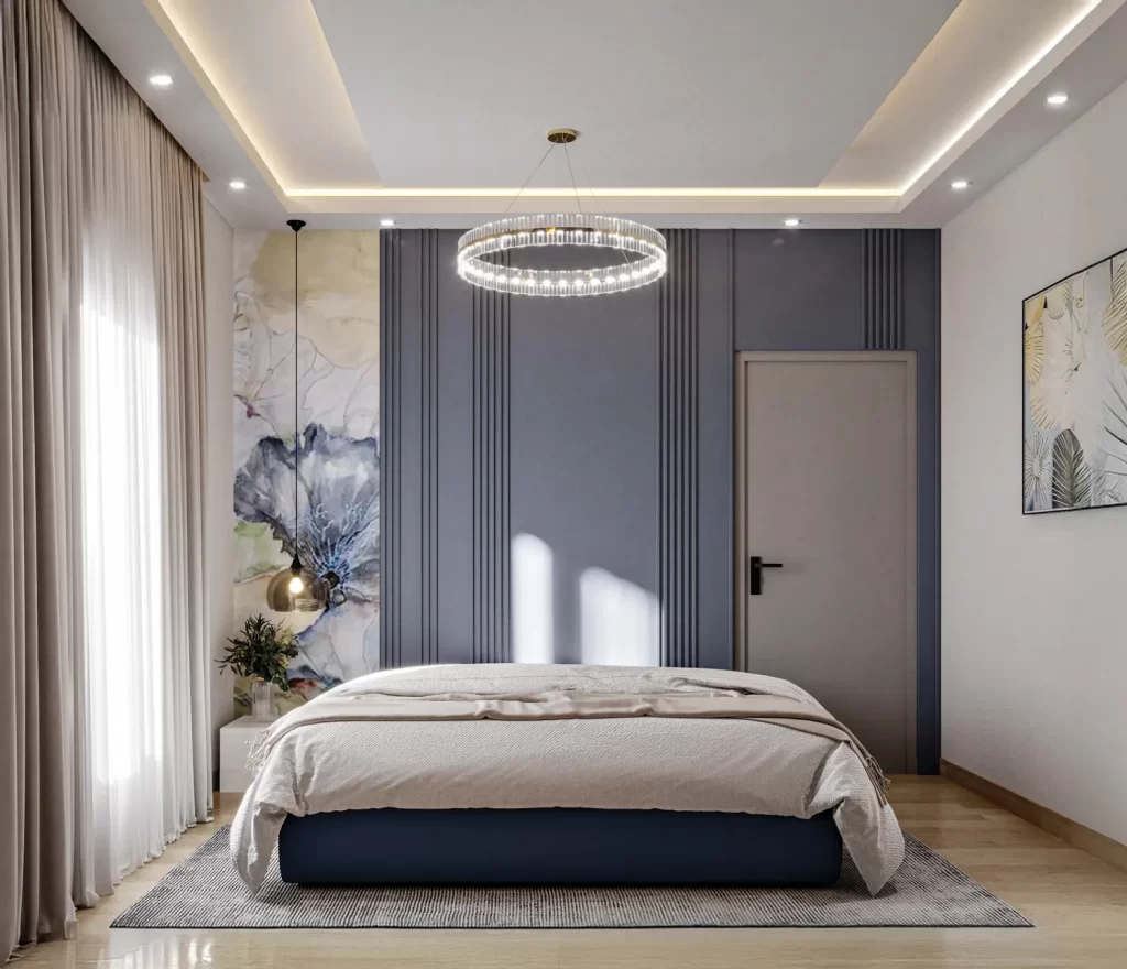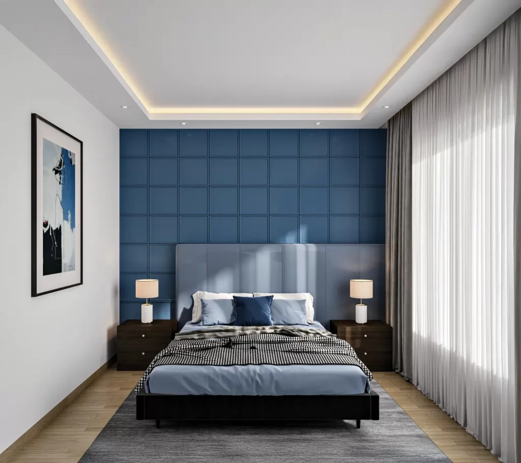 This bedroom design exudes a calm and contemporary vibe, featuring a balanced blend of sophistication and comfort. The soothing blue accent wall creates a serene focal point, while the sleek furniture and clean lines enhance the room’s modern aesthetic. Soft lighting and natural daylight streaming through sheer curtains add warmth and openness, making the space feel both inviting and restful, perfect for a modern home retreat.