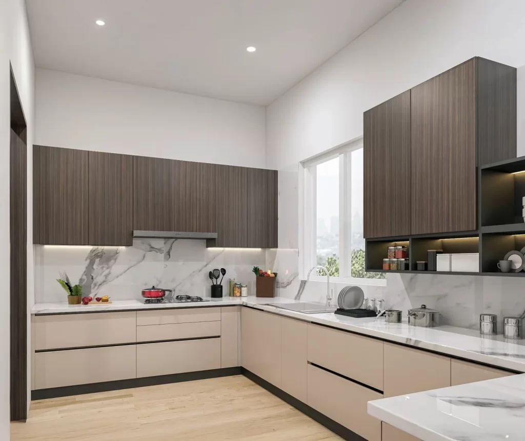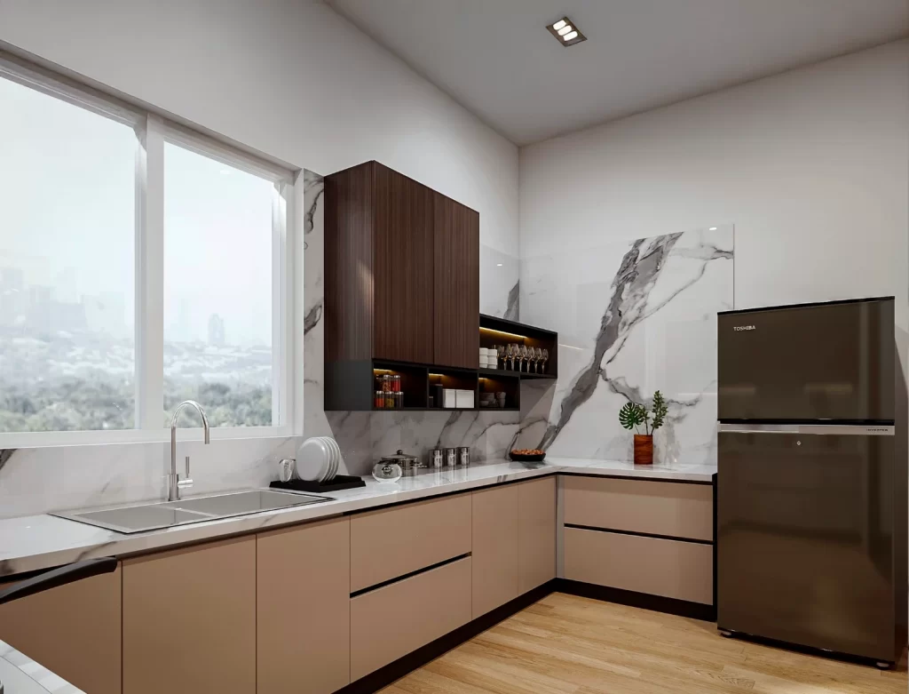 This modern kitchen interior design idea showcases a sleek and sophisticated design featuring a neutral beige and wood color palette. The marble backsplash adds a luxurious touch, while the spacious countertops and minimalist cabinetry enhance functionality. Natural light floods the room through large windows, creating a bright and airy atmosphere. The seamless blend of textures and finishes makes this kitchen both elegant and practical perfect for contemporary living.