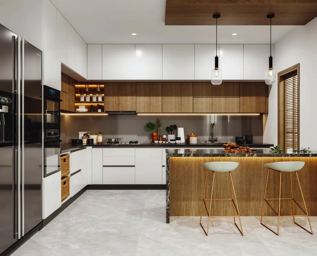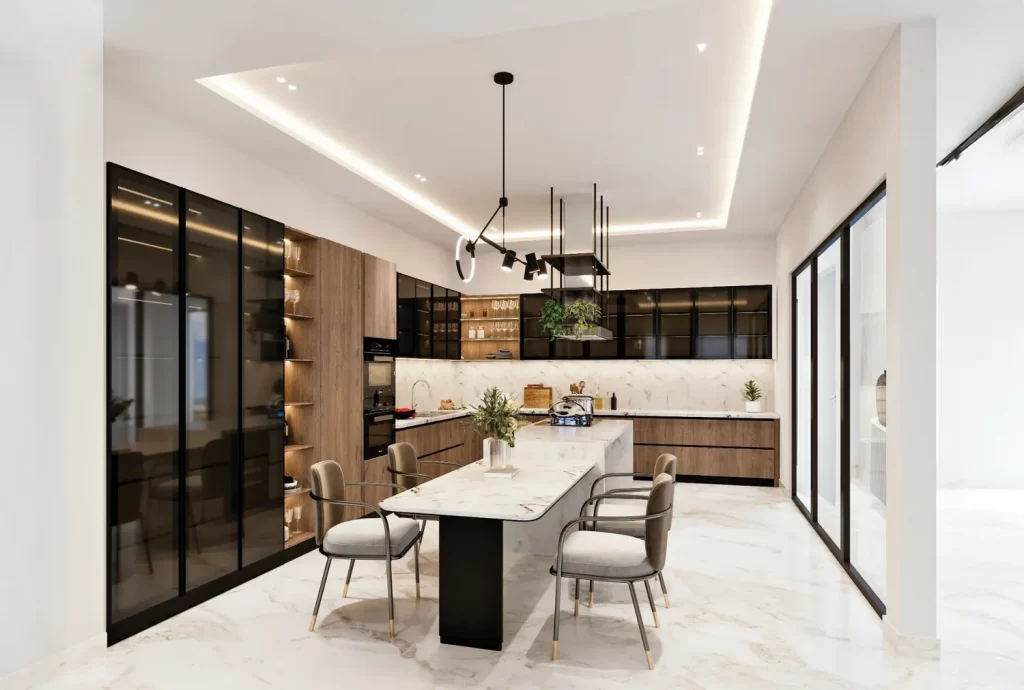 This elegant kitchen interior design idea blends modern design with natural warmth. Featuring sleek white cabinetry, frosted glass storage, and a neutral herringbone backsplash, the space feels bright and airy. The wooden dining set adds a cozy, organic touch, while soft pendant lighting enhances the welcoming ambiance perfect for both family meals and stylish entertaining. A harmonious mix of functionality and aesthetics defines this contemporary kitchen design.