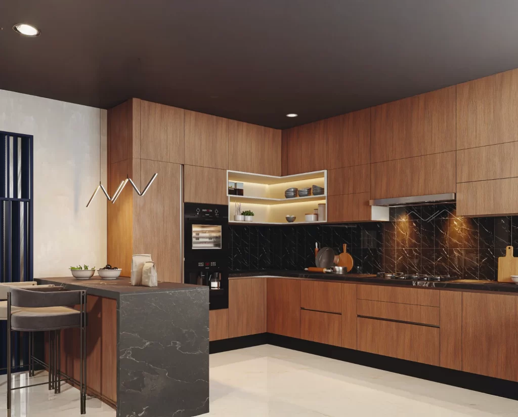 This stylish modern kitchen features rich wooden cabinetry paired with a sleek black marble backsplash, creating a luxurious contrast. Warm under-cabinet lighting enhances the textured finishes, while integrated appliances and minimalist design offer a seamless, contemporary look. The elegant breakfast counter with pendant lighting adds functionality and sophistication perfect for modern homes that balance comfort, class, and practicality.