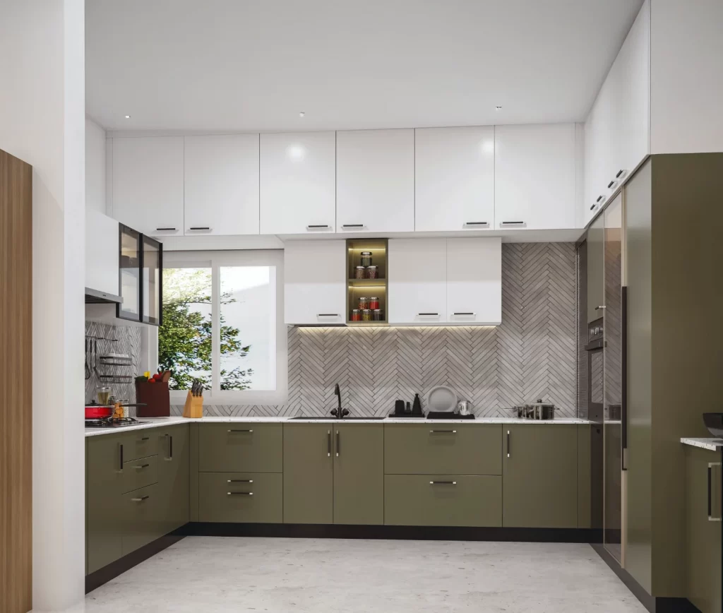This elegant modular kitchen design idea showcases a perfect blend of functionality and modern aesthetics. The combination of olive green lower cabinets and sleek white overhead units creates a clean, balanced look. A herringbone-patterned backsplash adds subtle texture, while under-cabinet lighting enhances the ambiance. Ample storage, minimalist handles, and natural light from the window make this kitchen both stylish and practical for contemporary homes.