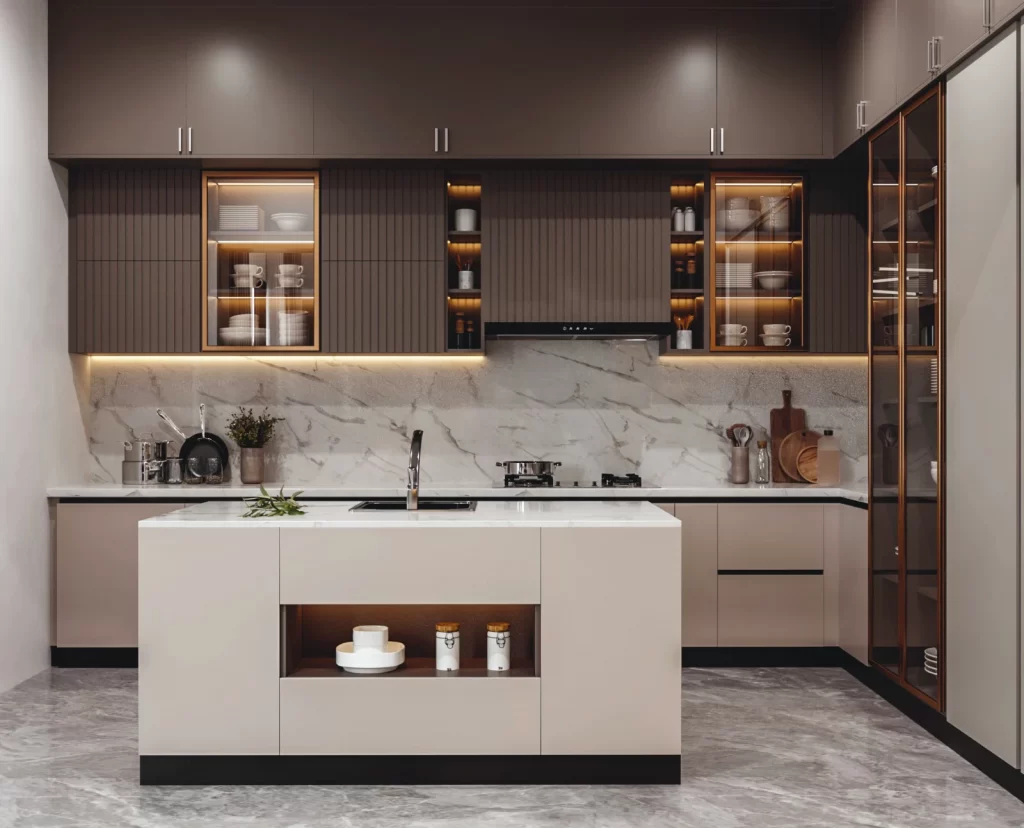 This luxurious modular kitchen interior design idea combines sophistication and functionality with a seamless blend of matte brown and beige finishes. The marble backsplash and countertops add a touch of elegance, while the warm under-cabinet lighting enhances the ambiance. Glass-front cabinets showcase fine crockery, and the central island with open shelving provides style and practicality, creating a perfect modern kitchen for contemporary living.